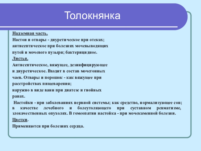 Настой и отвар - при болезнях печени, почек и мочевыводящих путей, органов желудочно-кишечного тракта, нарушении обмена веществ, простуде, кашле.