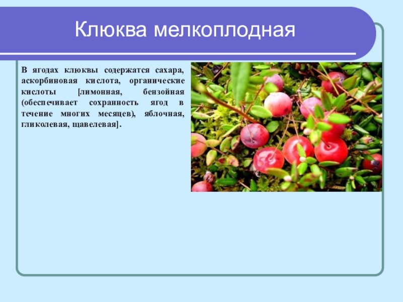 бензойная (обеспечивает сохранность ягод в течение многих месяцев), яблочная, гликолевая, щавелевая].