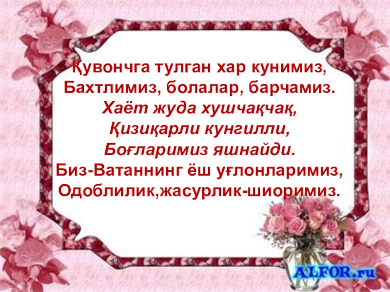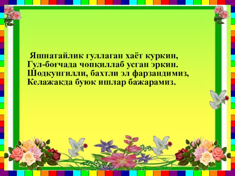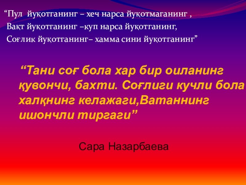 “Тани соғ бола хар бир оиланинг қувончи, бахти. Соғлиги кучли бола халқнинг келажаги,Ватаннинг ишончли тиргаги”