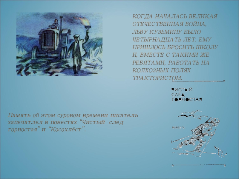 Память об этом суровом времени писатель запечатлел в повестях “Чистый след горностая” и “Косохлёст”.