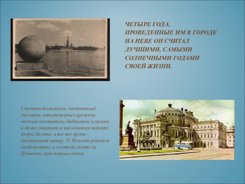 Студент техникума, постоянный участник литературных кружков, частый посетитель библиотек и музеев и даже статист в знаменитом театре оперы балета, в то же время - начинающий автор, Л. Кузьмин решился опубликовать в местной газете (в Пушкине) свои первые стихи.