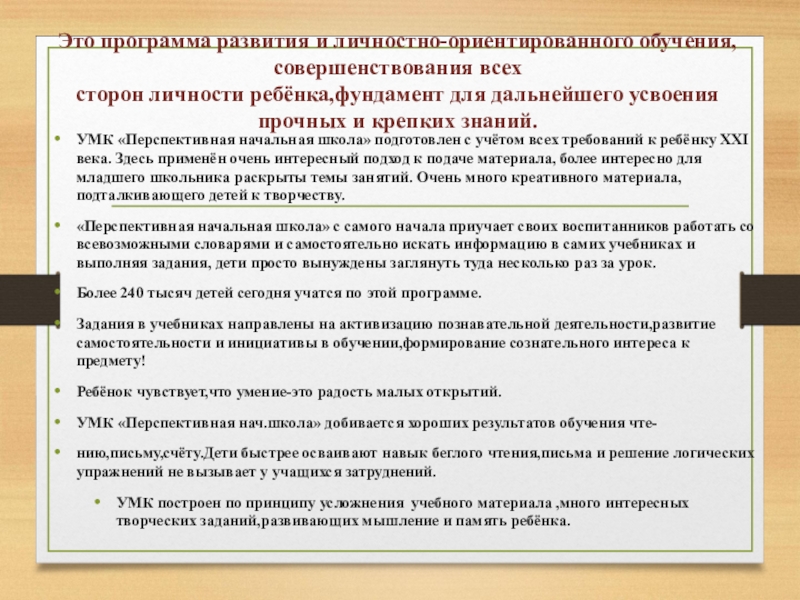 УМК «Перспективная начальная школа» подготовлен с учётом всех требований к ребёнку XXI века. Здесь применён очень интересный подход к подаче материала, более интересно для младшего школьника раскрыты темы занятий. Очень много креативного материала, подталкивающего детей к творчеству.