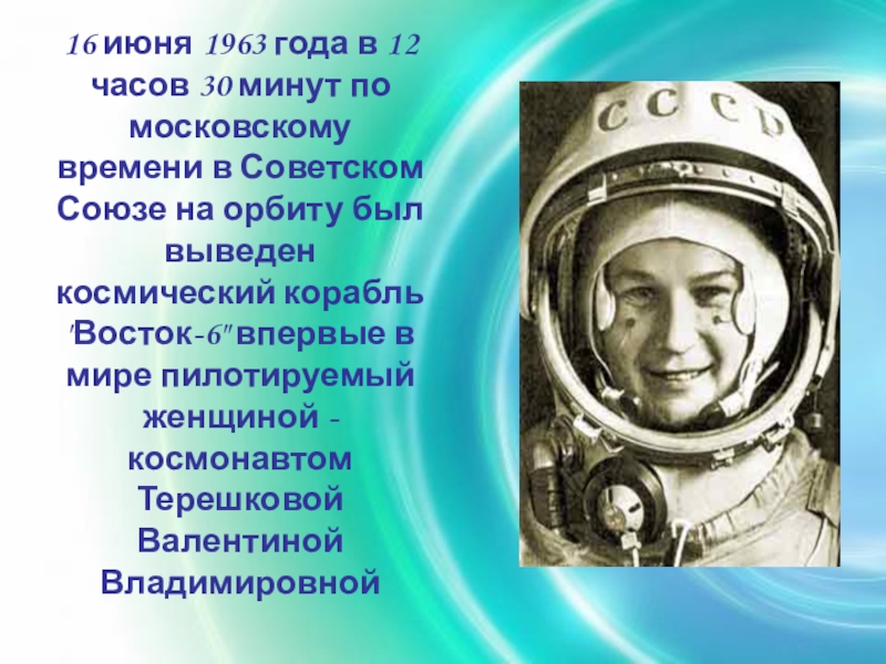 времени в Советском Союзе на орбиту был выведен космический корабль "Восток-6" впервые в мире пилотируемый женщиной - космонавтом Терешковой Валентиной Владимировной