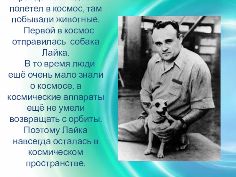 Слайд 7Прежде чем человек полетел в космос, там побывали животные.