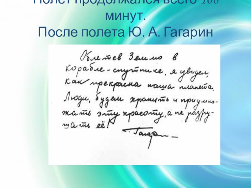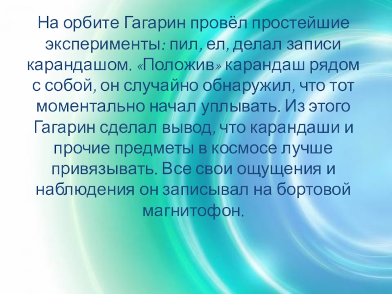 Слайд 15На орбите Гагарин провёл простейшие эксперименты: пил, ел, делал записи карандашом.