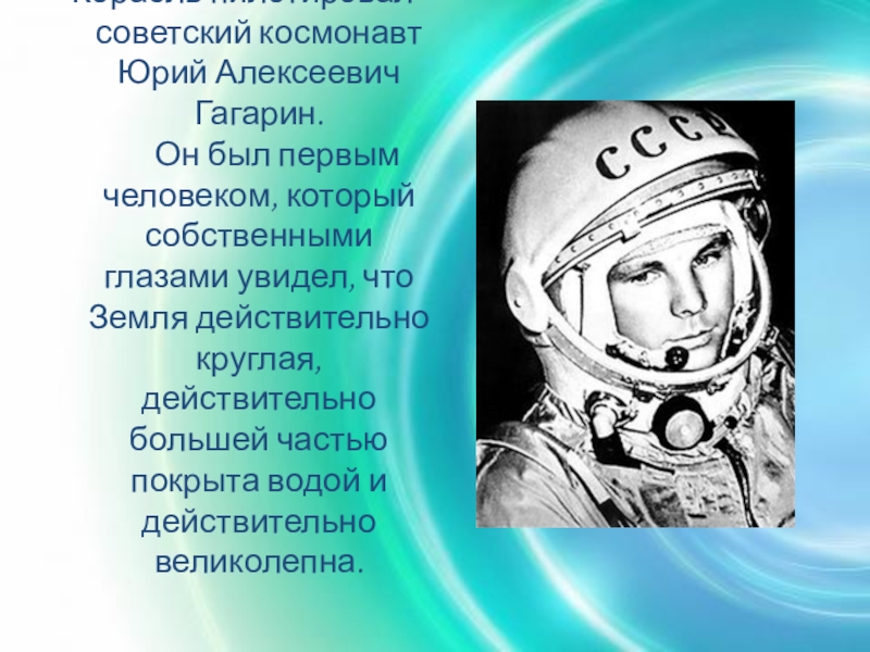 Слайд 11Корабль пилотировал советский космонавт Юрий Алексеевич Гагарин.