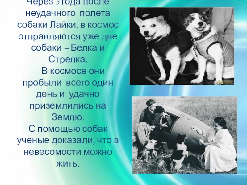 Слайд 8Через 3 года после неудачного полета собаки Лайки, в космос отправляются