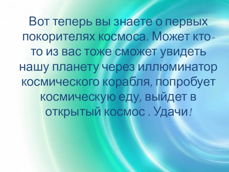 Слайд 20Вот теперь вы знаете о первых покорителях космоса. Может кто-то из
