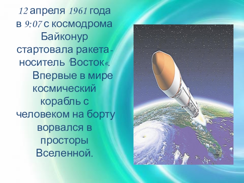 Слайд 1012 апреля 1961 года в 9:07 с космодрома Байконур стартовала ракета-носитель