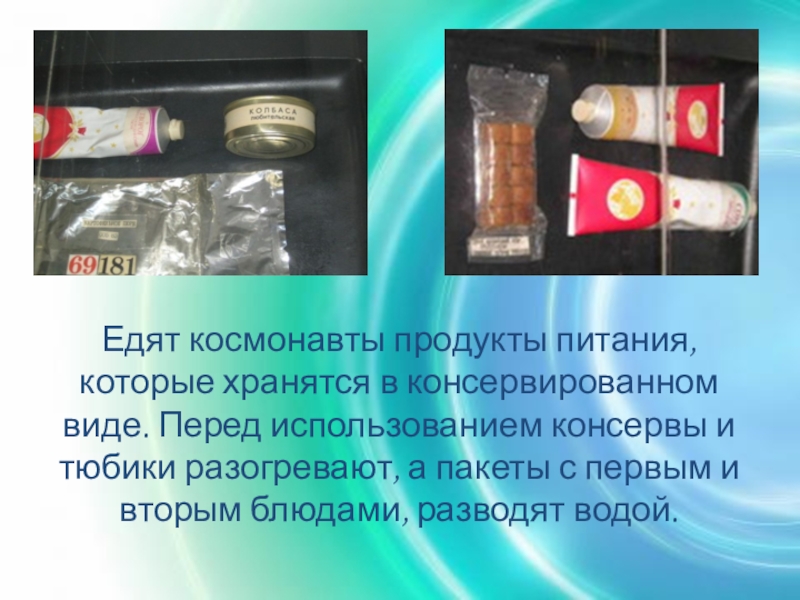 Слайд 16Едят космонавты продукты питания, которые хранятся в консервированном виде. Перед использованием