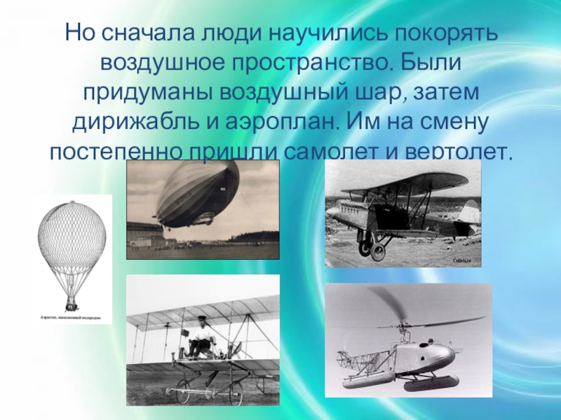 затем дирижабль и аэроплан. Им на смену постепенно пришли самолет и вертолет.