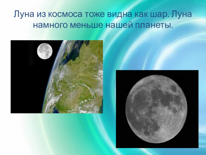 Слайд 13Луна из космоса тоже видна как шар. Луна намного меньше нашей