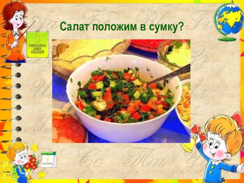 Слайд 16Салат положим в сумку?