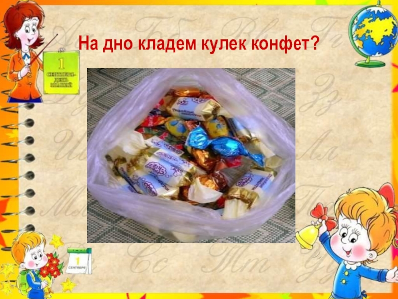 Слайд 7На дно кладем кулек конфет?