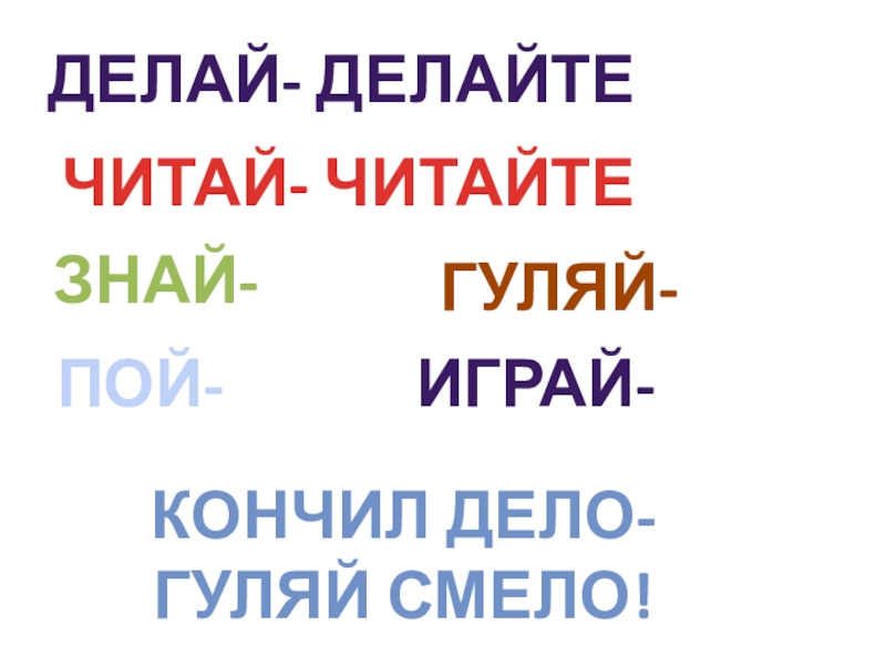Делай- делайтеЧИТАЙ- ЧИТАЙТЕЗНАЙ-ПОЙ-ГУЛЯЙ-ИГРАЙ-Кончил дело- гуляй смело!