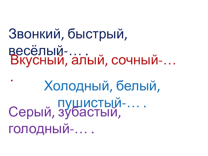 Звонкий, быстрый, весёлый-… .Вкусный, алый, сочный-… .Холодный, белый, пушистый-… .Серый, зубастый, голодный-… .