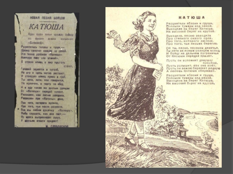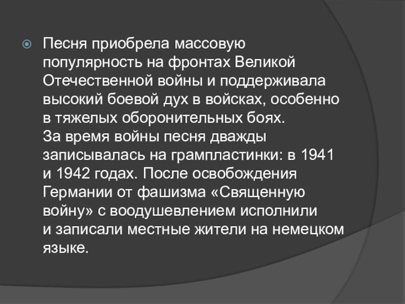 Слайд 5Песня приобрела массовую популярность на фронтах Великой Отечественной войны и поддерживала высокий боевой