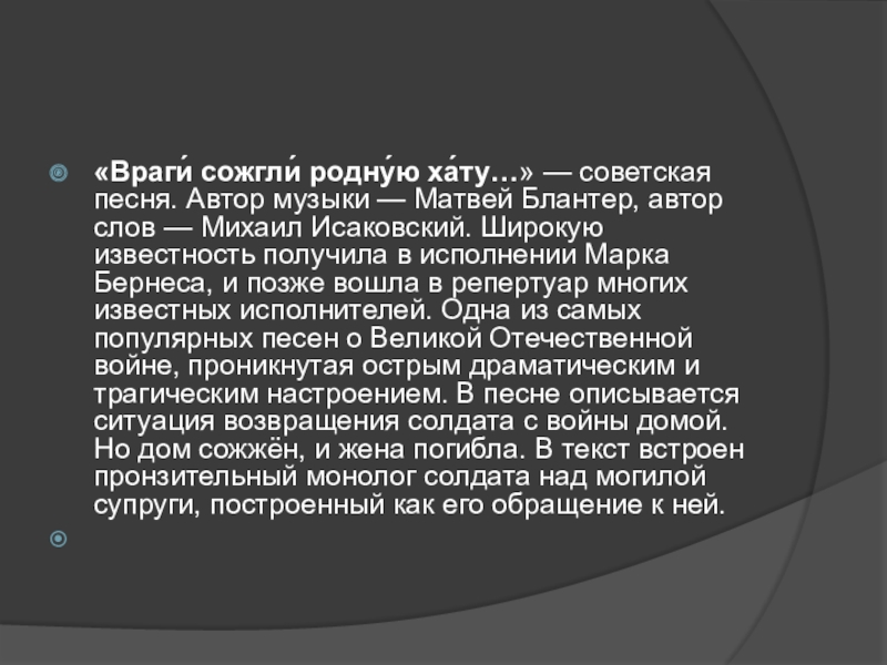Слайд 12«Враги́ сожгли́ родну́ю ха́ту…» — советская песня. Автор музыки — Матвей Блантер, автор слов — Михаил
