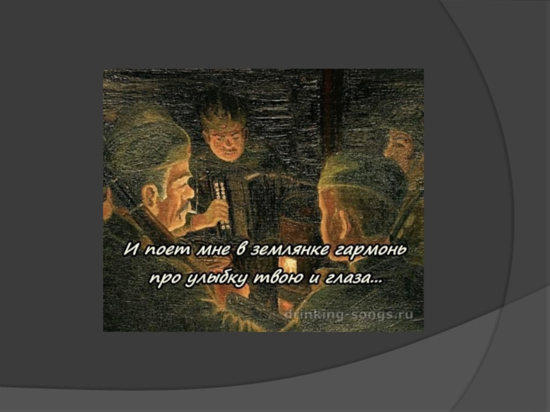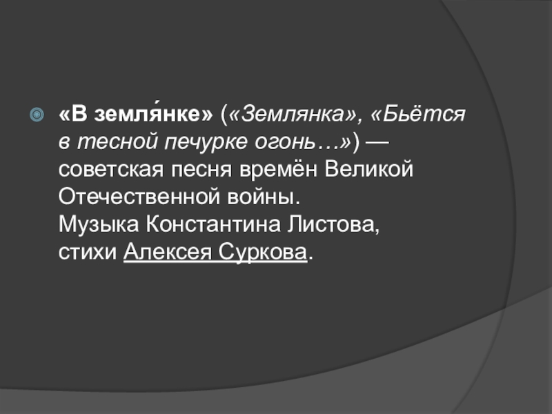 Слайд 6«В земля́нке» («Землянка», «Бьётся в тесной печурке огонь…») — советская песня времён Великой Отечественной войны. Музыка Константина