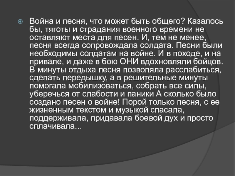 страдания военного времени не оставляют места для песен. И, тем не менее, песня всегда сопровождала солдата. Песни были необходимы солдатам на войне. И в походе, и на привале, и даже в бою ОНИ вдохновляли бойцов. В минуты отдыха песня позволяла расслабиться, сделать передышку, а в решительные минуты помогала мобилизоваться, собрать все силы, уберечься от слабости и паники А сколько было создано песен о войне! Порой только песня, с ее жизненным текстом и музыкой спасала, поддерживала, придавала боевой дух и просто сплачивала...