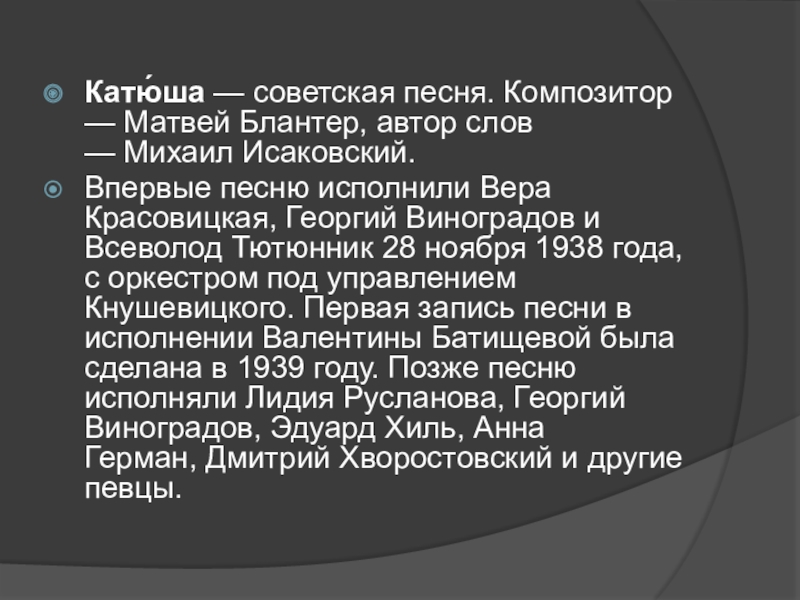 Слайд 10Катю́ша — советская песня. Композитор — Матвей Блантер, автор слов — Михаил Исаковский.