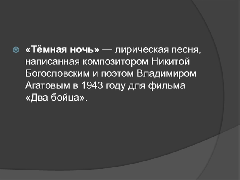 Слайд 8«Тёмная ночь» — лирическая песня, написанная композитором Никитой Богословским и поэтом Владимиром Агатовым в 1943 году для фильма «Два бойца».
