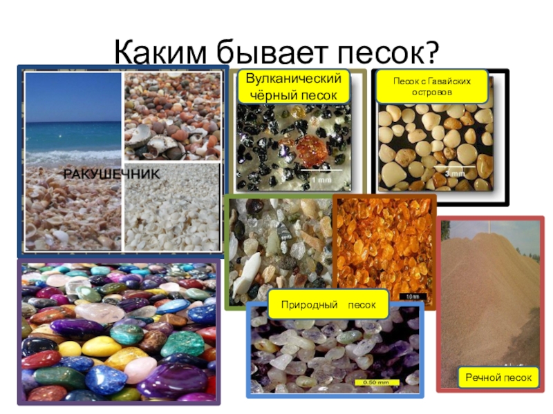Каким бывает песок?Вулканический чёрный песокПесок с Гавайских острововРечной песокПриродный  песок