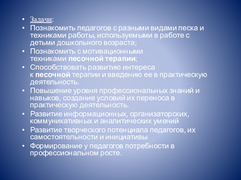 Задачи:Познакомить педагогов с разными видами песка и техниками работы, используемыми в работе с детьми дошкольного возраста;Познакомить с
