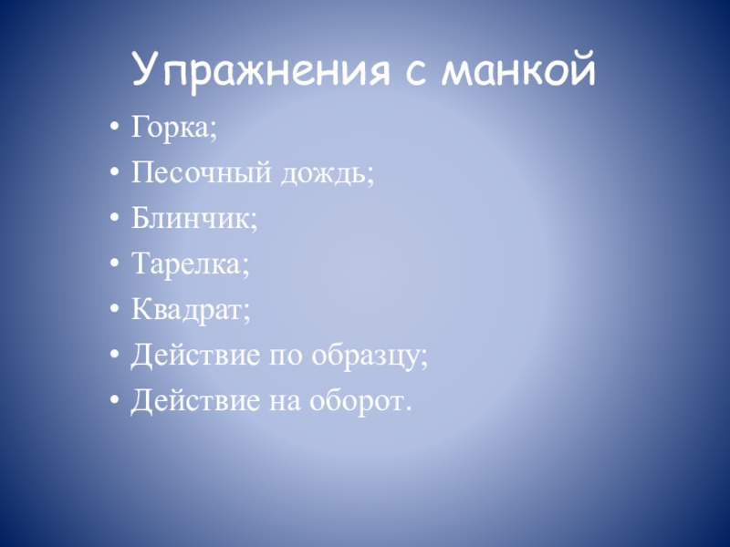 Упражнения с манкойГорка;Песочный дождь;Блинчик;Тарелка;Квадрат;Действие по образцу;Действие на оборот.