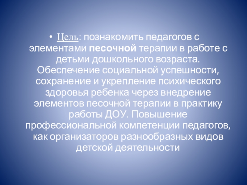 Цель: познакомить педагогов с элементами песочной терапии в работе с детьми дошкольного возраста. Обеспечение социальной успешности, сохранение и укрепление