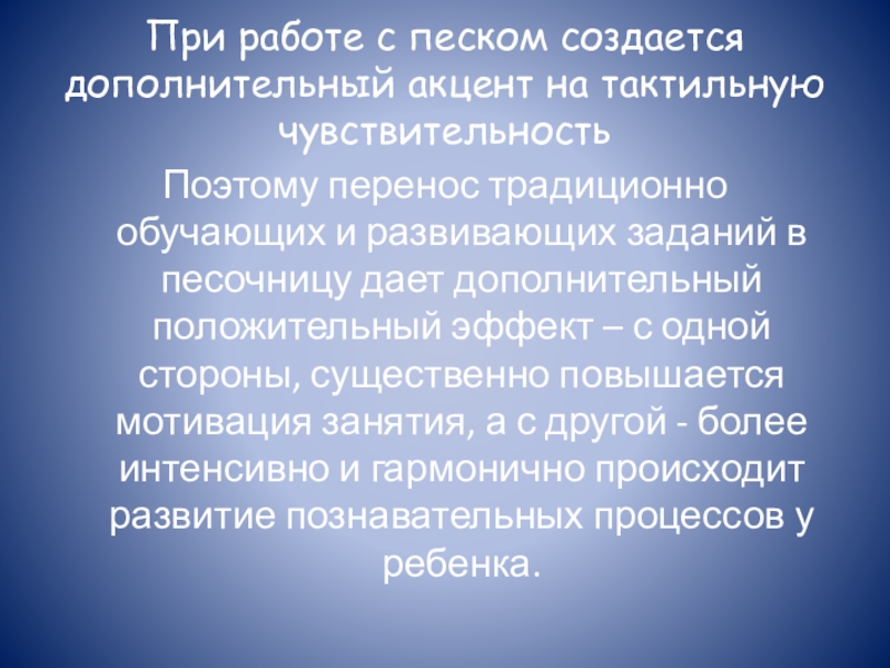 Слайд 18При работе с песком создается дополнительный акцент на тактильную чувствительность