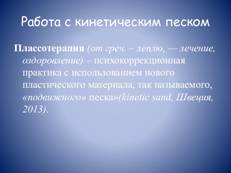 Работа с кинетическим пескомПлассотерапия (от греч. – леплю, — лечение, оздоровление) – психокоррекционная практика с использованием нового пластического материала,