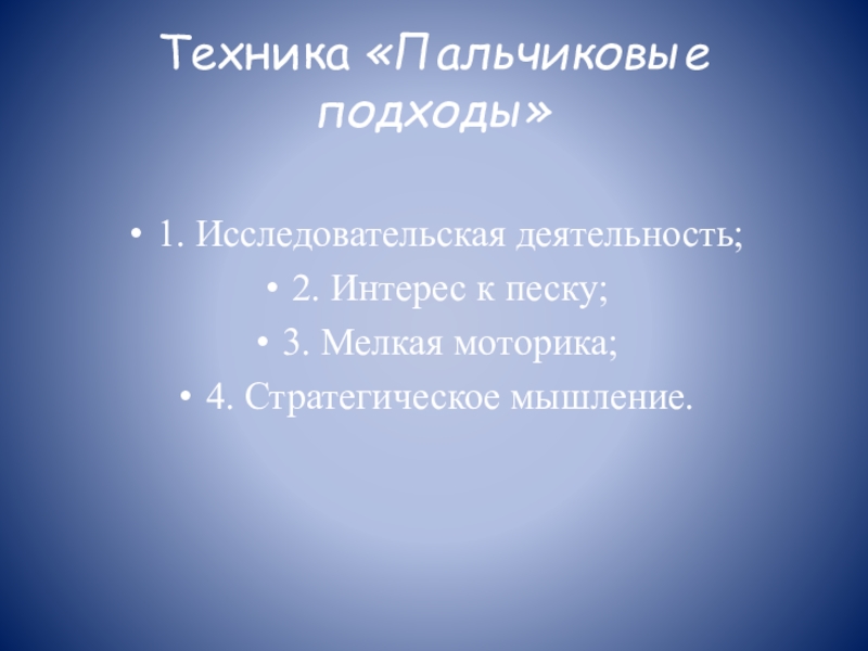 Техника «Пальчиковые подходы» 1. Исследовательская деятельность;2. Интерес к песку;3. Мелкая моторика;4. Стратегическое мышление.