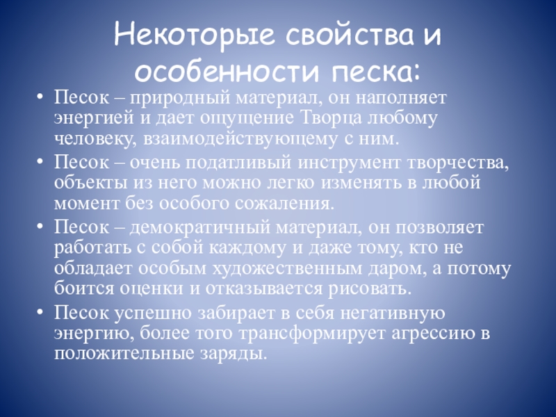 Некоторые свойства и особенности песка:Песок – природный материал, он наполняет энергией и дает ощущение Творца любому человеку,