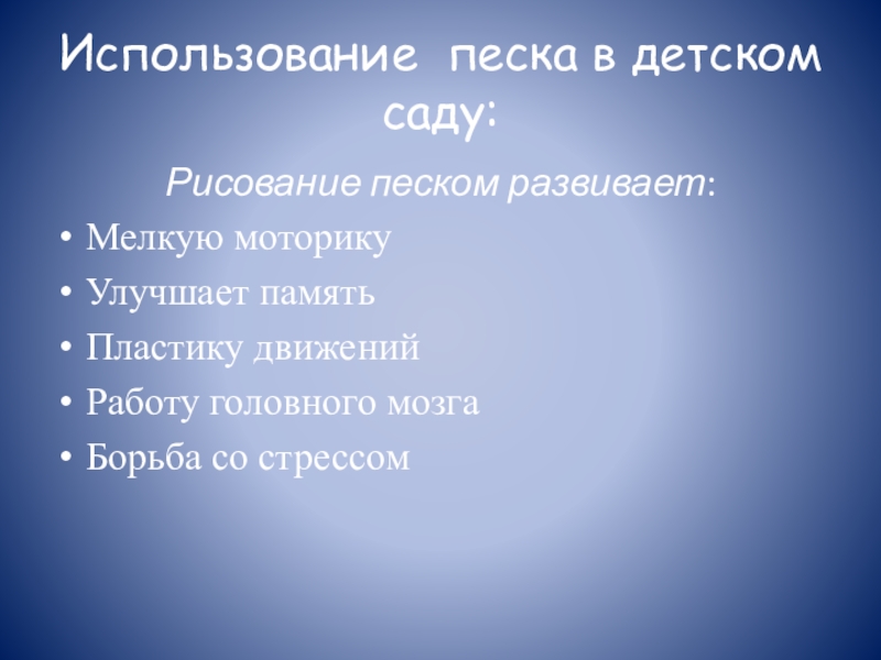 Использование песка в детском саду:Рисование песком развивает:Мелкую моторикуУлучшает памятьПластику движенийРаботу головного мозгаБорьба со стрессом