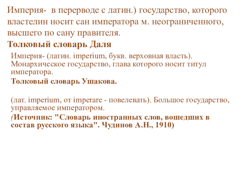 Империя- (латин. imperium, букв. верховная власть). Монархическое государство, глава которого носит титул императора.