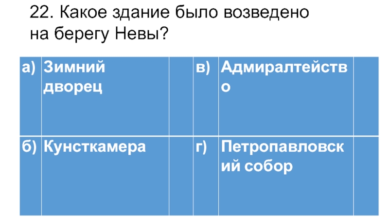 Слайд 2222. Какое здание было возведено на берегу Невы?