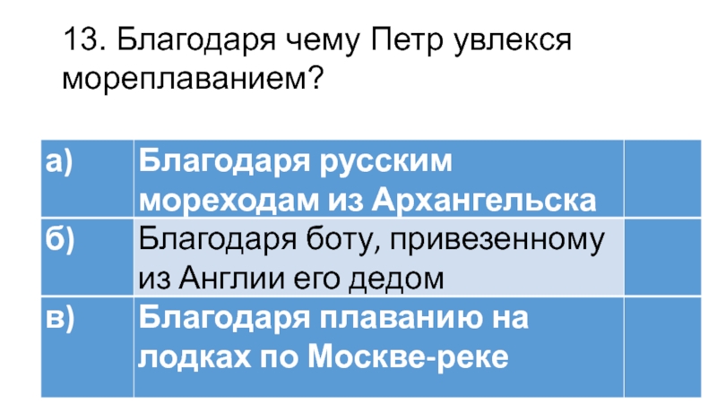 Слайд 1313. Благодаря чему Петр увлекся мореплаванием?