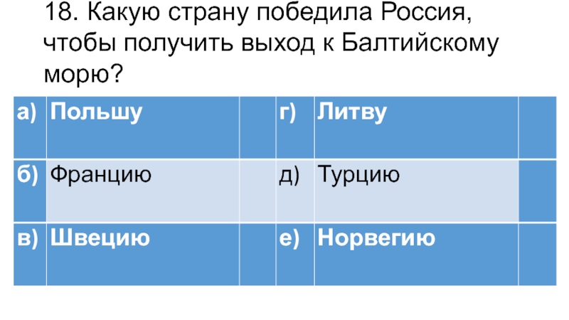 Слайд 1818. Какую страну победила Россия, чтобы получить выход к Балтийскому морю?