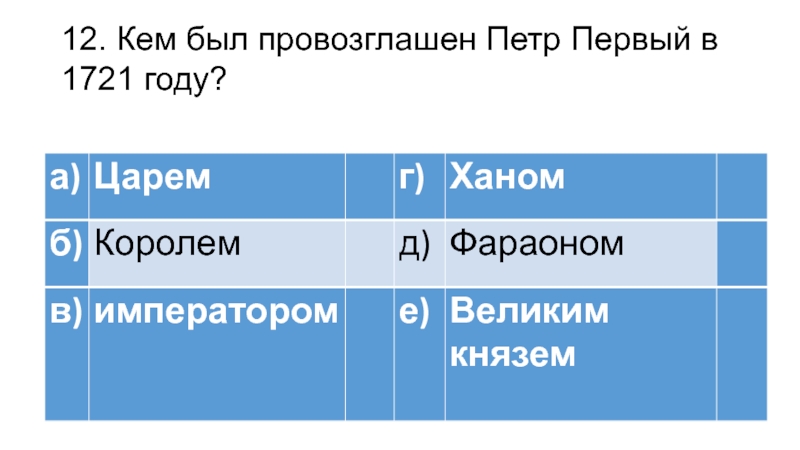 Слайд 1212. Кем был провозглашен Петр Первый в 1721 году?