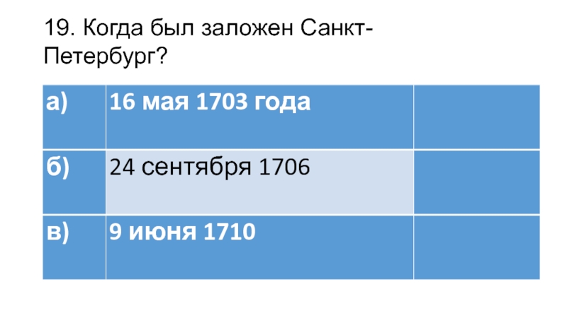 Слайд 1919. Когда был заложен Санкт-Петербург?