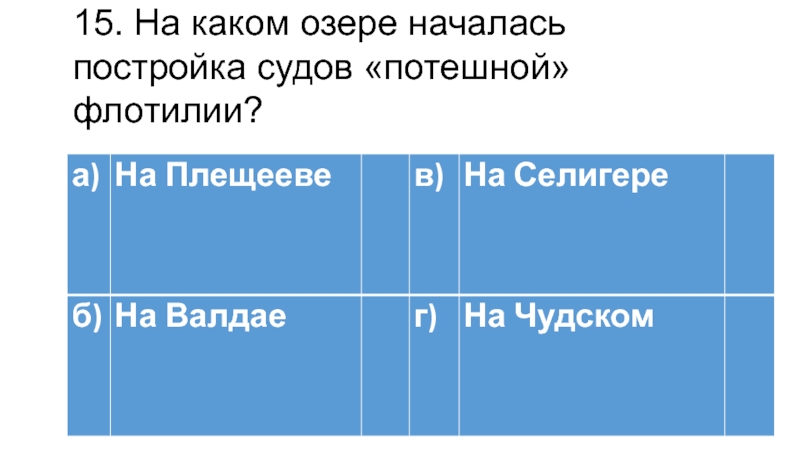 Слайд 1515. На каком озере началась постройка судов «потешной» флотилии?