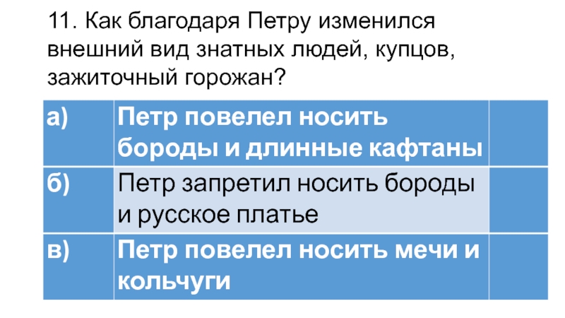 Слайд 1111. Как благодаря Петру изменился внешний вид знатных людей, купцов, зажиточный