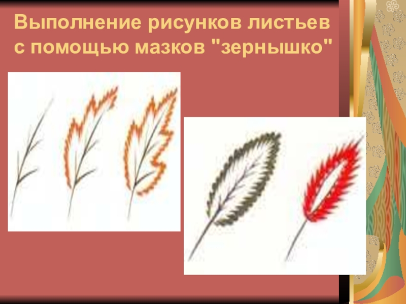 Слайд 19Выполнение рисунков листьев с помощью мазков "зернышко"