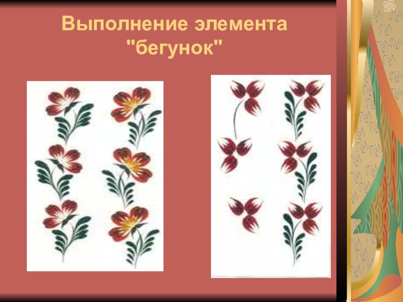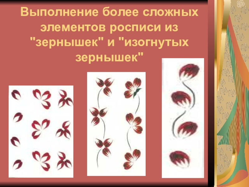 Слайд 16Выполнение более сложных элементов росписи из "зернышек" и "изогнутых зернышек"
