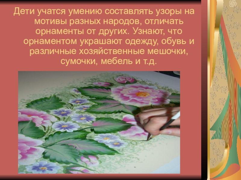 Дети учатся умению составлять узоры на мотивы разных народов, отличать орнаменты от других. Узнают, что орнаментом украшают