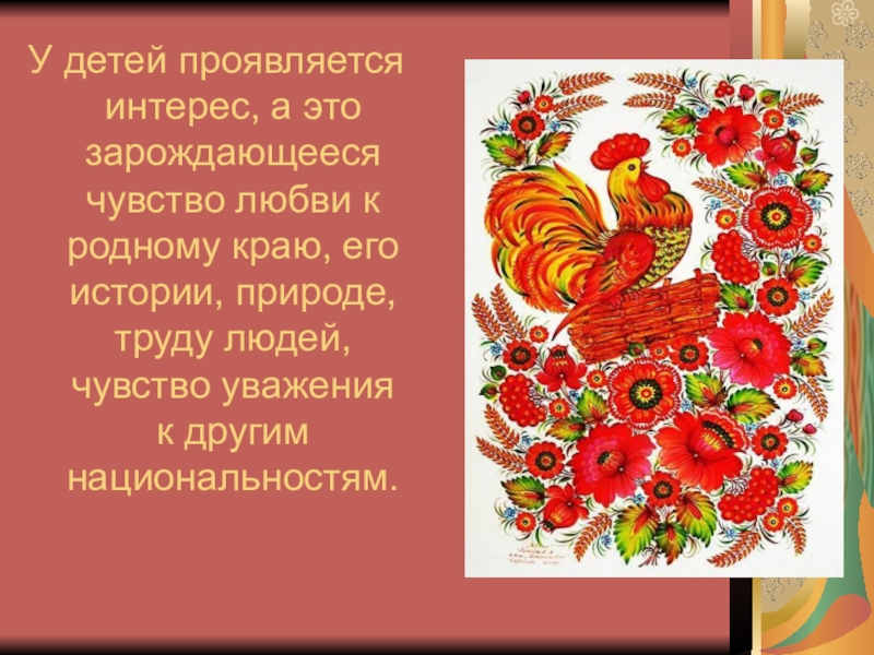 Слайд 14У детей проявляется интерес, а это зарождающееся чувство любви к родному