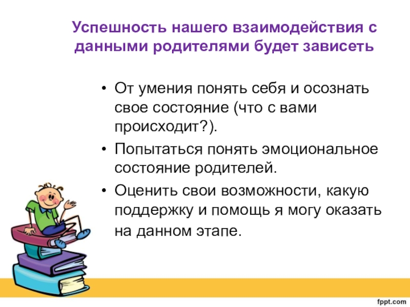 Слайд 17Успешность нашего взаимодействия с данными родителями будет зависеть