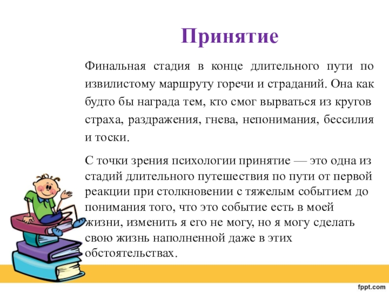 С точки зрения психологии принятие — это одна из стадий длительного путешествия по пути от первой реакции при столкновении с тяжелым событием до понимания того, что это событие есть в моей жизни, изменить я его не могу, но я могу сделать свою жизнь наполненной даже в этих обстоятельствах.
