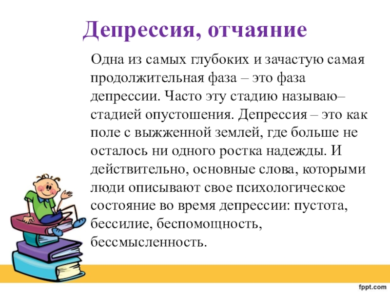 фаза – это фаза депрессии. Часто эту стадию называю– стадией опустошения. Депрессия – это как поле с выжженной землей, где больше не осталось ни одного ростка надежды. И действительно, основные слова, которыми люди описывают свое психологическое состояние во время депрессии: пустота, бессилие, беспомощность, бессмысленность.